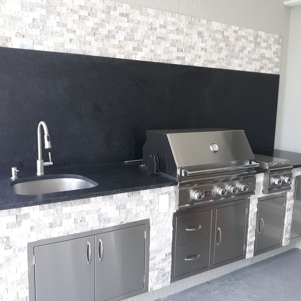 Explore our stunning outdoor kitchen designs featuring grills, sinks, stone countertops, and stainless steel appliances. Whether you're looking for a modern fireplace with a TV above or a stone bar and grill setup, our designs offer both functionality and style.